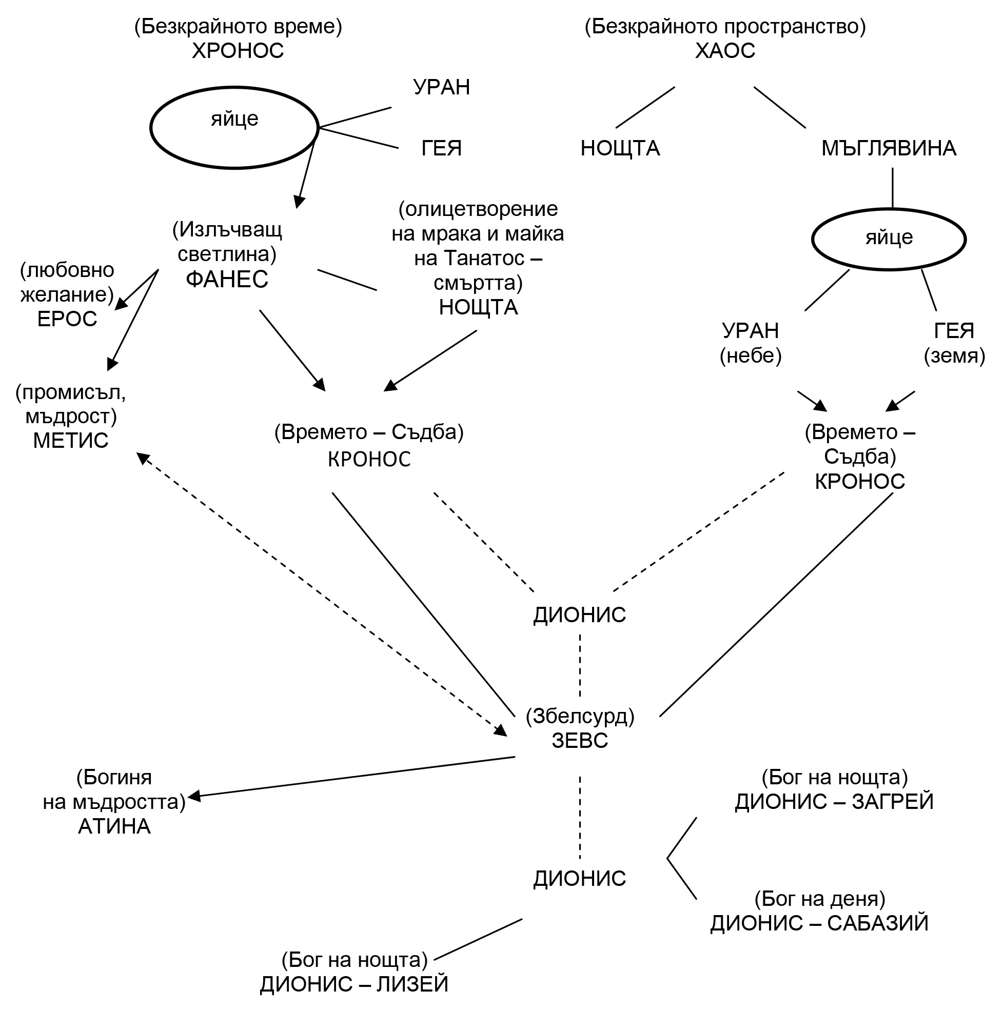 За елините първоизточник на всичко е Хаоса. При тях не съществува идеята за Световното Яйце. От Хаоса се появява Гея. Тя е неродена. Гея ражда Уран (Небето). В последствие синът на Гея – Уран, става нейн съпруг и от него тя ражда Кронос (Времето-Съдба), чието планетно съответствие е Сатурн. Кронос е детрониран от сина си Зевс. Първата съпруга на Зевс е Мèтис (Мъдростта), но понеже научил, че наследникът му от нея ще го убие, той погълнал Мèтис. Наследникът на Мèтис не умрял. Това била богинята Атина, която изскочила от главата на Зевс в пълно бойно снаряжение. Атина е богинята на мъдростта.